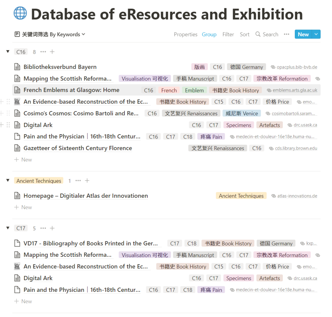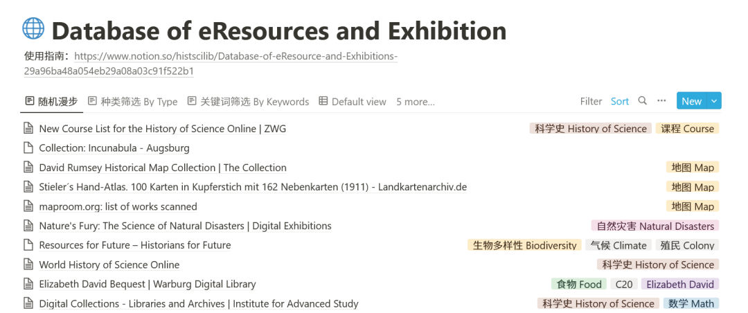 目前科学史图书馆有四个平台,网页、Zotero、微信公众号及学术信息数据库。此前,我们已经发布了新书数据库和申请/征稿信息信息数据库。今天我们公开的是电子资源和在线展览数据库(Database of eResource and Exhibitions),会议信息数据库也即将与读者见面。在Notion上,我们使用代表互联网的emoji来标记电子资源和在线展览数据库。