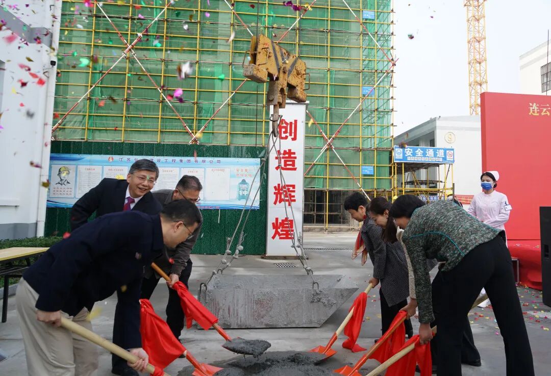 随后,主席台领导共同挥锹为连云港市中医院中医综合能力提升工程——检验综合楼封顶浇筑最后一方混凝土。一时间礼花齐放、鼓乐齐鸣,封顶仪式顺利完成。