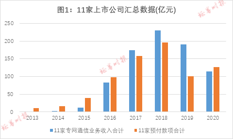 将11家上市公司的数据汇总会发现:其一,这11家上市公司合计的专网通信业务收入经历了迅猛增加又快速下降的过程,且是影响11家上市公司总营业收入的重要因素;其二,这11家上市公司历年合计的预付款项变化趋势,与合计的专网通信业务规模变化基本趋同。在业务最高峰的2018年,11家上市公司的专网通信业务收入合计达到230亿元,预付款项也达到196亿元的峰值(图1及前述表1)。