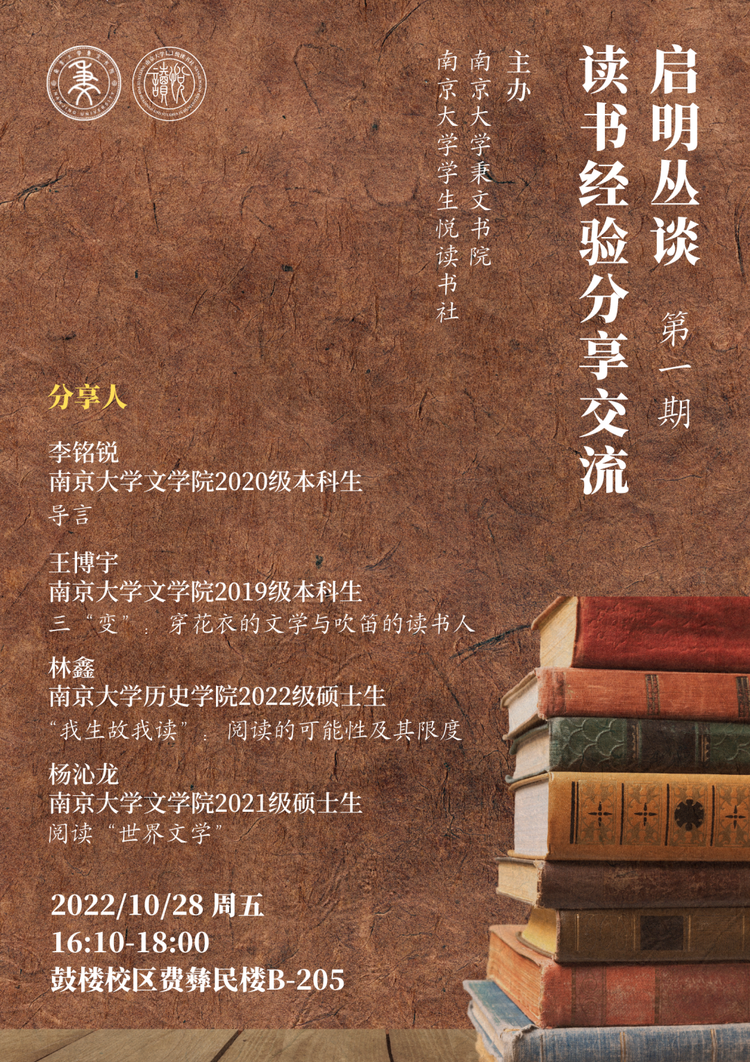 第一期“启明丛谈”以读书经验分享交流为主题。由悦读书社现任社长、文学院2020级本科生李铭锐同学主持开讲,文学院2019级本科生王博宇、历史学院2022级硕士生林鑫、文学院2021级硕士生杨沁龙三位同学依次分享。三位同学在读书方法上颇有心得,亦在读书经验上多有积累。他们将从不同角度展开分享,相信将给新生同学们带来读书内容、读书方法上的启发。欢迎同学们参与分享会,交流读书中遇到的问题和困惑。