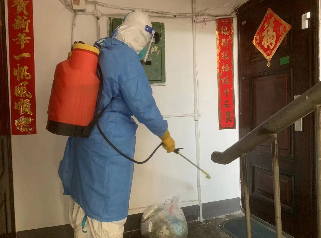 城西公安分局民警对小区楼道内进行消杀工作,确保安全。![]()