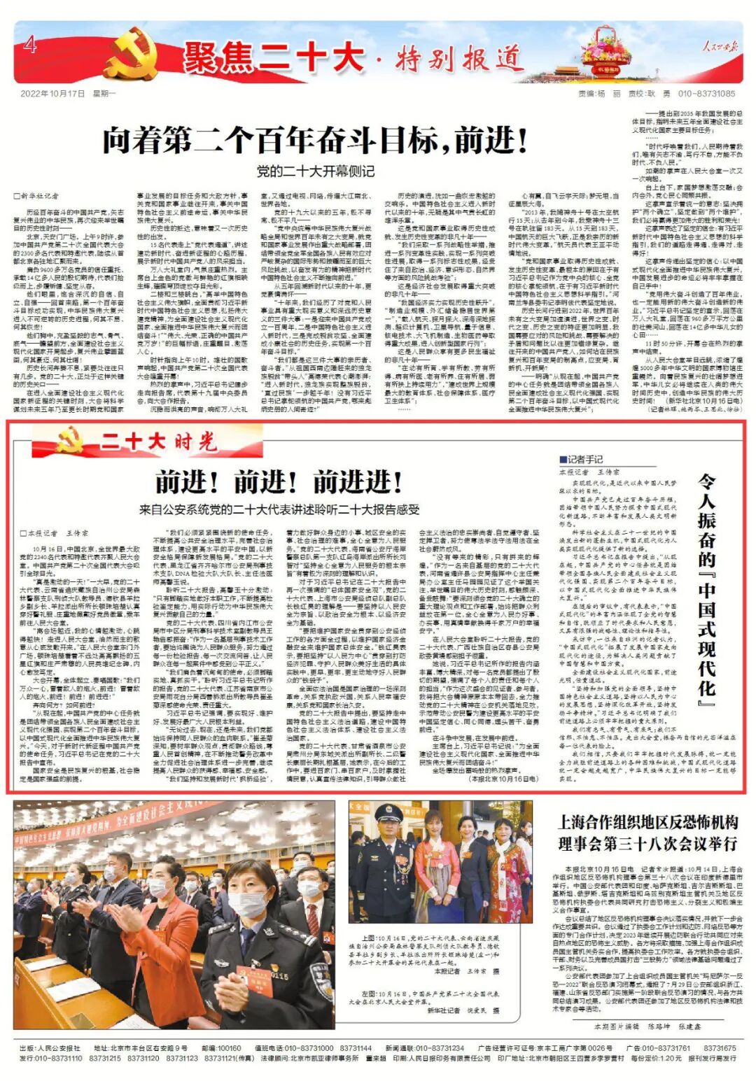“从现在起,中国共产党的中心任务就是团结带领全国各族人民全面建成社会主义现代化强国、实现第二个百年奋斗目标,以中国式现代化全面推进中华民族伟大复兴。”今天,对于新时代新征程中国共产党的使命任务,习近平总书记在党的二十大报告中宣布。国家安全是民族复兴的根基,社会稳定是国家强盛的前提。“我们必须紧紧围绕新的使命任务,不断提高公共安全治理水平,完善社会治理体系,建设更高水平的平安中国,以新安全格局保障新发展格局。”党的二十大代表、黑龙江省齐齐哈尔市公安局刑事技术支队DNA检验大队大队长、主任法医师高馨玉说。聆听二十大报告,高馨玉十分激动:“只有脚踏实地做好本职工作,不断提高检验鉴定能力,用实际行动为中华民族伟大复兴贡献自己的力量。”党的二十大代表、四川省内江市公安局市中区分局刑事科学技术室副教导员王艳倍感振奋:“作为一名基层刑事技术工作者,要始终围绕为人民群众服务,努力通过每一份检验报告、每一次交流问答,让人民群众在每一起案件中感受到公平正义。”“我们肩负着沉甸甸的使命,必须脚踏实地、真抓实干。”聆听习近平总书记所作的报告,党的二十大代表、江苏省南京市公安局雨花台分局西善桥派出所教导员崔圣菊深感使命光荣、责任重大。习近平总书记强调,要实现好、维护好、发展好最广大人民根本利益。“无论过去、现在,还是未来,我们党都始终保持同人民群众的血肉联系。”崔圣菊深知,要树牢群众观点,贯彻群众路线,尊重人民首创精神,在不断推动警务改革中全力促进社会治理体系进一步完善,继续提高人民群众的获得感、幸福感、安全感。“我们坚持和发展新时代‘枫桥经验’,着力做好群众身边的小事、城区安全的实事、社会治理的难事,全心全意为人民服务。”党的二十大代表、海南省公安厅海岸警察总队第一支队红岛海岸派出所所长刘智对“坚持全心全意为人民服务的根本宗旨”有着极为深刻的理解和认识。对于习近平总书记在二十大报告中再一次强调的“总体国家安全观”,党的二十大代表、上海市公安局经侦总队副总队长钱红昊的理解是——要坚持以人民安全为宗旨、以政治安全为根本、以经济安全为基础。“要把维护国家安全贯穿到公安经侦工作的各方面全过程,以维护国家经济金融安全来维护国家总体安全。”钱红昊表示,要把坚持“以人民为中心”贯穿到打防经济犯罪、守护人民群众美好生活的具体实践中,更早、更牢、更主动地守好人民群众的“钱袋子”。全面依法治国是国家治理的一场深刻革命,关系党执政兴国,关系人民幸福安康,关系党和国家长治久安。党的二十大报告中提出,要坚持走中国特色社会主义法治道路,建设中国特色社会主义法治体系、建设社会主义法治国家。党的二十大代表、甘肃省酒泉市公安局肃州分局东城关派出所副所长、二级警长康丽长期扎根基层,她表示,在今后的工作中,要进百家门、串百家户,及时掌握社情民意,认真宣传法律知识,引导群众做社会主义法治的忠实崇尚者、自觉遵守者、坚定捍卫者,努力使尊法学法守法用法在全社会蔚然成风。“没有等来的精彩,只有拼来的辉煌。”作为一名来自基层的党的二十大代表,河南省通许县公安局指挥中心主任兼局办公室主任马园园见证了这个举国关注、举世瞩目的伟大历史时刻,感触颇深、备受鼓舞:“要深刻领会党的二十大确立的重大理论观点和工作部署,始终把群众利益放在第一位,全心全意为人民办好事、办实事,用真情奉献换得千家万户的幸福安宁。”在人民大会堂聆听二十大报告,党的二十大代表、广西壮族自治区容县公安局政委黄墁感到担子很重。她说,习近平总书记所作的报告内涵丰富、博大精深,对每一名党员都提出了殷切的期望,强调了每个人的责任和每个人的担当,“作为这次盛会的见证者、参与者,我将把大会精神原原本本带回去,全力推动党的二十大精神在公安机关落地见效,示范带动公安民警为建设更高水平的平安中国坚定信心、同心同德,埋头苦干、奋勇前进。”主席台上,习近平总书记说:“为全面建设社会主义现代化国家、全面推进中华民族伟大复兴而团结奋斗!”