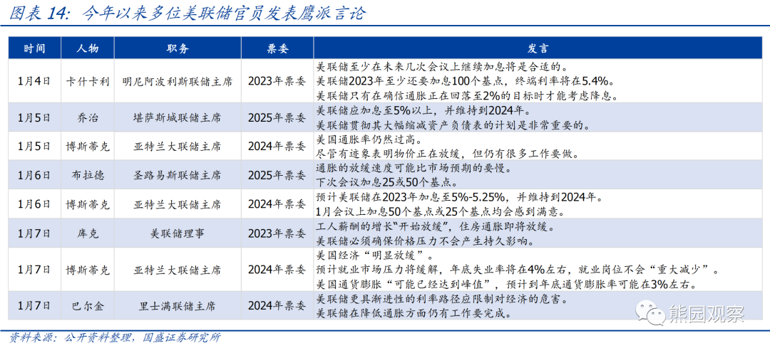 high);其二,FOMC全体票委认为2023年不会降息;其三,许多官员认为货币政策应平衡两种风险,一是货币政策限制性不足可能造成通胀位于2%目标以上的时间更长,并可能导致通胀预期失锚;二是货币政策滞后的累积效应可能会导致经济活动不必要减少。![]()
