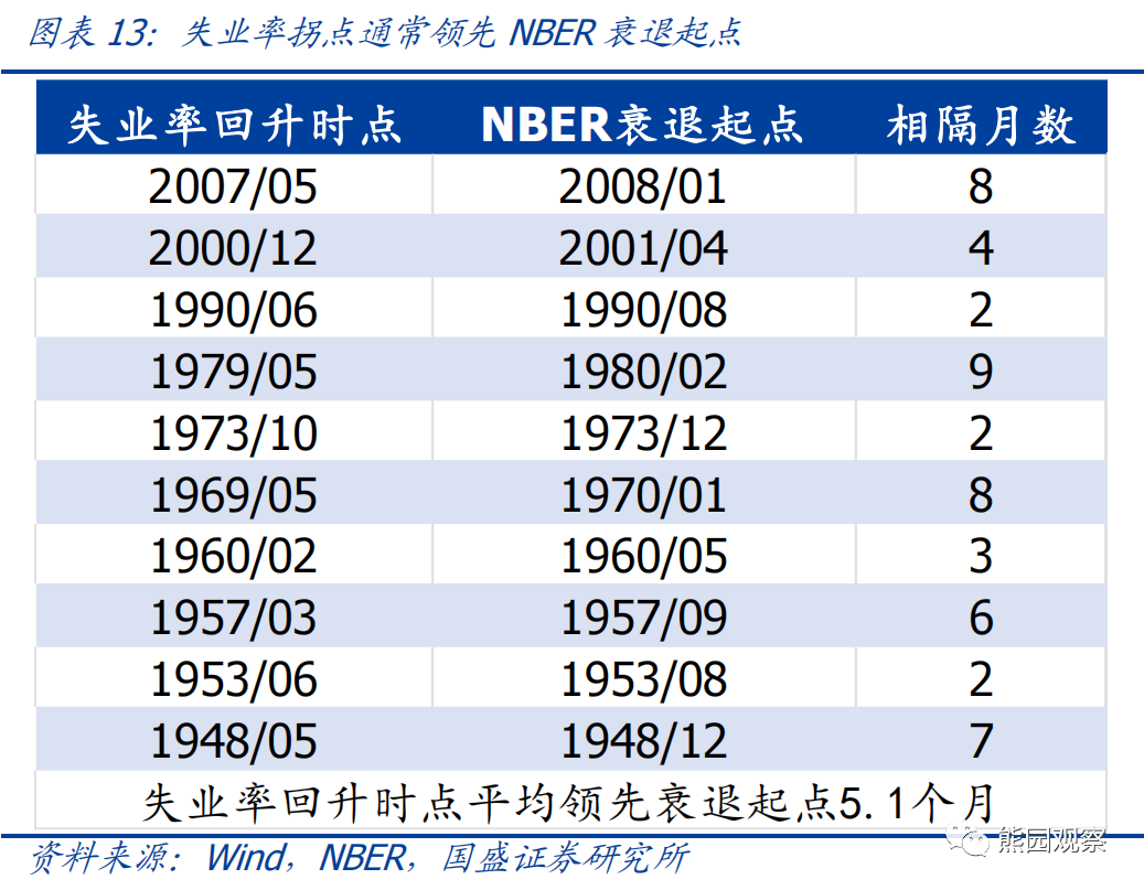 3、美国失业率何时回升,对衰退的指示意义如何?如何看待美联储后续货币政策?>失业率拐点时间:历史数据表明,美国制造业和服务业PMI跌破50%后,失业率拐点通常在不久后出现,失业率拐点平均领先衰退5个月。数据显示,12月美国制造业PMI连续两个月处于线下,服务业PMI较上月大跌6.9个百分点至49.6%、时隔两年半再度低于荣枯线;分项看,12月制造业PMI新订单项连续4个月低于50%,12月服务业PMI新订单项大跌10.8个百分点至45.2%,新订单大幅下行预示企业盈利在未来可能下降、招聘需求可能收缩,指向劳动力市场会进一步降温。我们对二战后(除疫情外)11次衰退进行了复盘,发现失业率向上拐点领先NBER衰退起点2-9个月不等,平均领先5个月。从这一角度出发,美国经济大概率在二季度就会陷入衰退,与前期模型预测结果一致。![]()