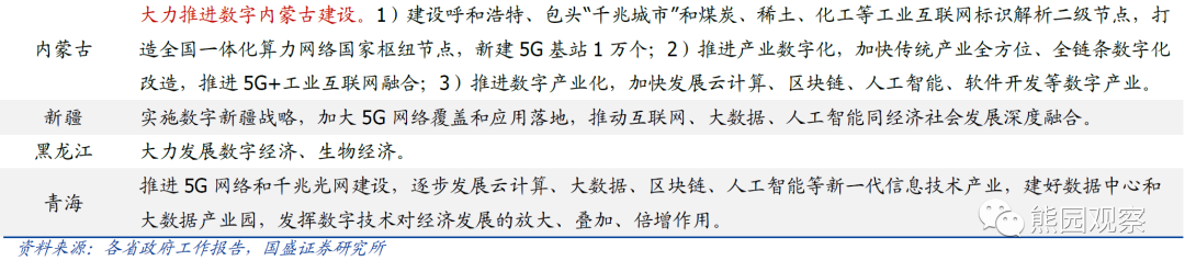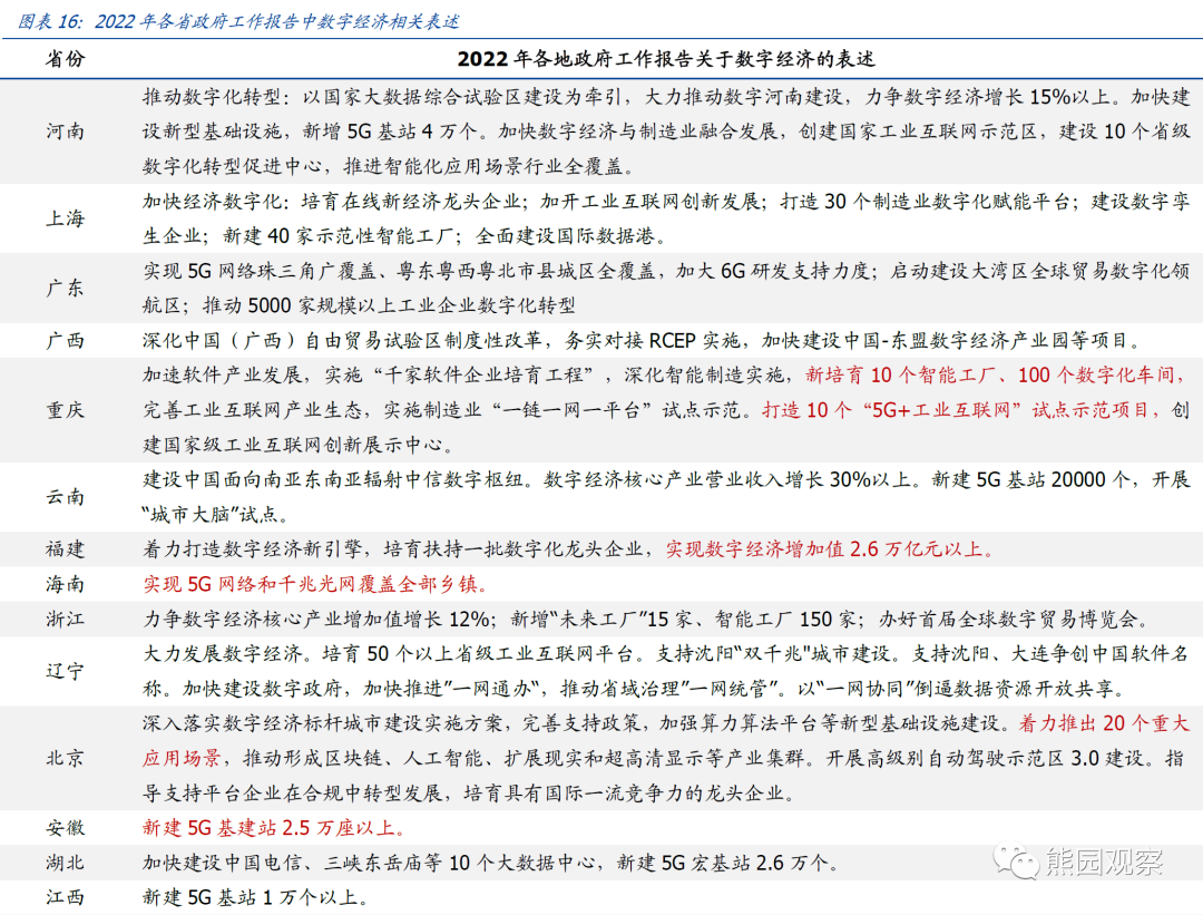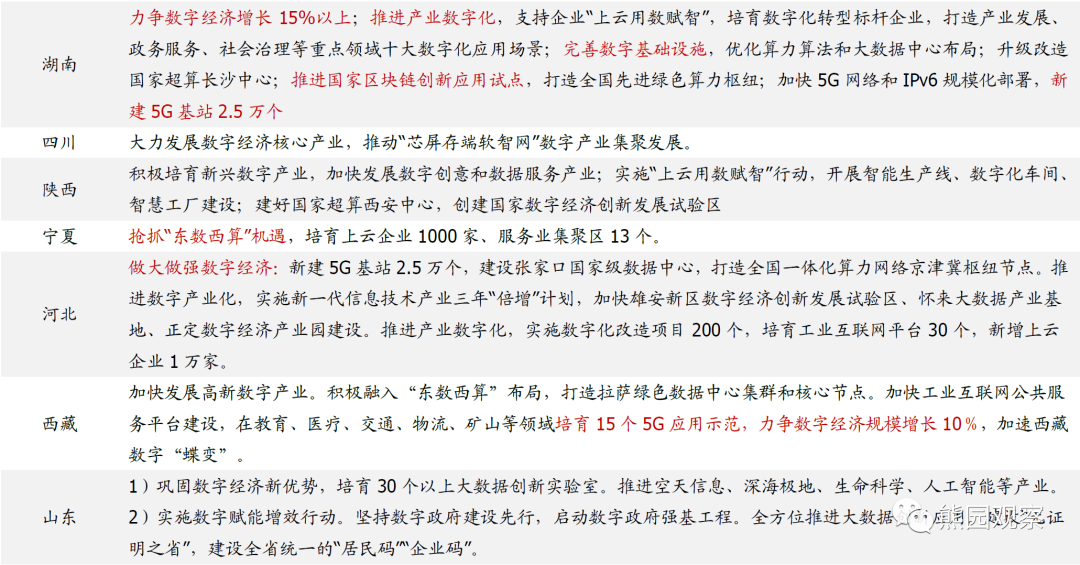 4、数字经济重要性进一步提升,数据基础设施、智能化等是重点总体看,几乎所有省份都对数字经济发展提出了明确规划,5G网络建设、数据中心、智能化等是各地关注的重点。福建、浙江、湖南、西藏等对数字产业发展也有明确规划,其中福建要求“数字经济增加值2.6万亿元以上”,浙江、湖南、西藏分别要求数字经济增长12%、15%和10%。![]()