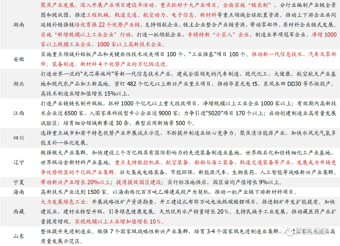3、高端制造继续发力,汽车、集成电路、高端装备等是重点领域总体看,各省规划发力方向主要集中在汽车、集成电路、信息技术、高端装备、生物医药、新能源等领域;同时,各地也强调根据自身现有产业优势,进行优势产业链的拓展、延伸和高端化、智能化转型。比如河南强调“立足电气、矿山、盾构、起重机械、轴承、农机等优势领域,推动传统装备向高端化、智能化转型”;河北强调“打造钢铁、装备制造两个万亿级产业”;重庆重点发力汽车产业、电子产业以及装备制造产业。![]()