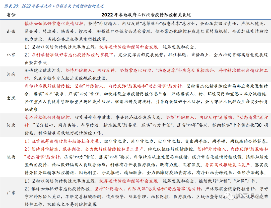 信号9:其他关注点:疫情防控、共同富裕等1、各地“动态清零”总方针未变,各地防疫措施短期仍将偏严各地均强调“抓好常态化疫情防控”、“坚持‘外防输入、内防反弹’总策略和‘动态清零’总方针”,预示国内“动态清零”的政策方针短期不会改变,各地疫情防控措施仍将偏严。但同时,多地强调“统筹疫情防控和经济社会发展、继续做好‘六稳’、‘六保’工作”,意味着经济下行背景下,在做好疫情防控的同时,“稳增长”也是题中之义。![]()