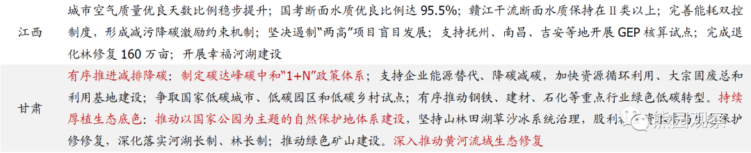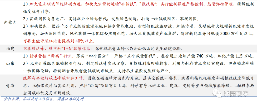 2、多数省份仍然强调“双碳”、“双控”,但有新变化河北、辽宁、甘肃、新疆、陕西、青海等多地强调“有序”推进“双碳”,应是对2021年部分地区运动式减碳的回应和纠偏,辽宁强调“能耗强度目标在‘十四五’规划期内统筹考虑”,预示相比2021年,2022年相关政策可能会有所松动。具体内容上看,遏制“两高”项目盲目发展、加速推进新能源、重点行业节能降碳等是重点;另外,山西、重庆、湖南、福建等多地强调完善本省碳达峰、碳中和“1+N”政策体系。![]()