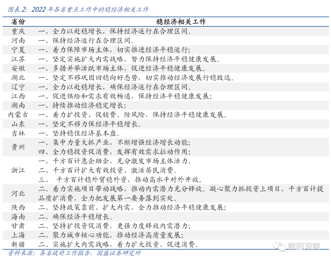 各省多将稳增长作为2022年排名靠前的重点工作。从重点工作安排看,各省的稳增长意愿强烈:如重庆、河南、江苏等14个省份均将稳增长、保持经济平稳运行等作为2022年的重点工作之首;河北、海南等6个省份将稳增长、扩内需作为重点工作的第2位(第1位是做好疫情防控、实施好国家重大战略、产业升级等);其余省份没有明确提及稳增长,但多数也将扩大内需、促消费、推进重大项目投资等作为排名靠前的重点工作。