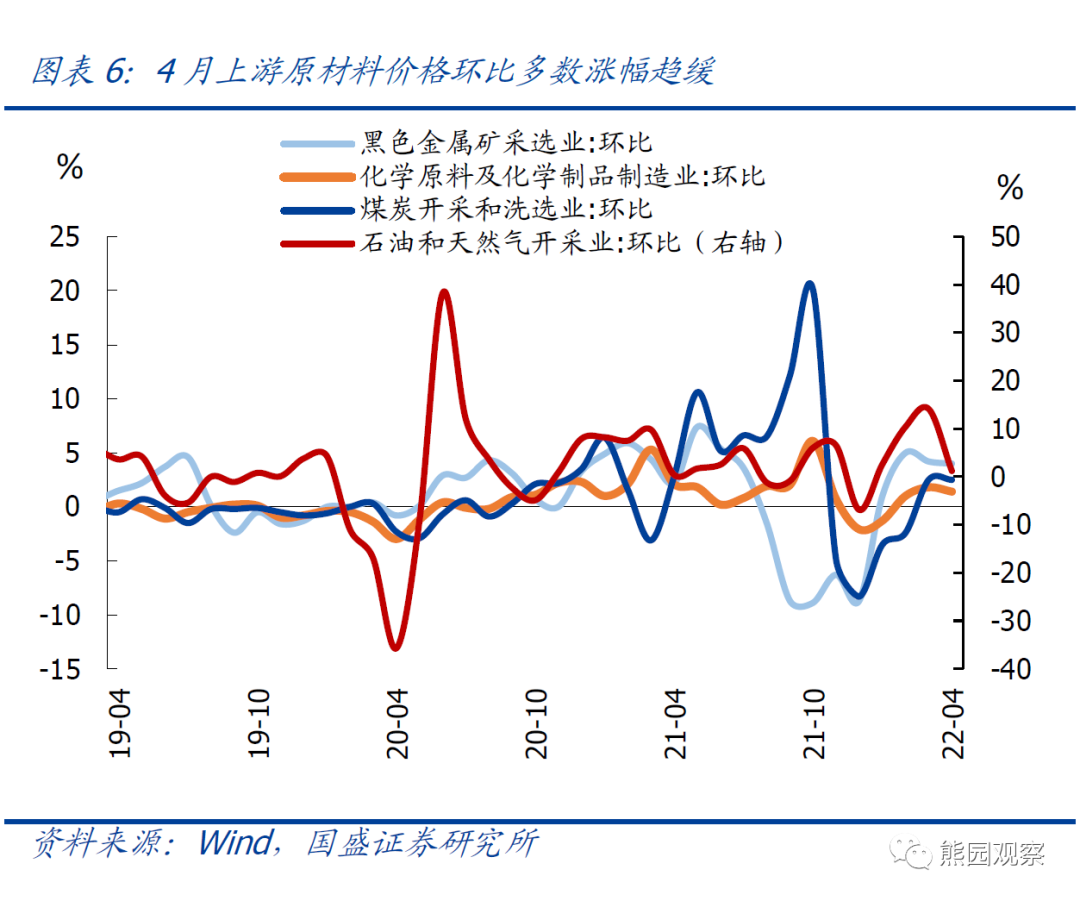 >分七大产业看:上游采掘、原材料价格环比涨幅明显收窄,中下游产业环比多数持平或小降。具体看,上游采掘、原材料价格环比分别较前值回落2.8、1.5个百分点至2.0%、1.4%;中游加工工业、耐用消费品环比持平0.4%、0.0%;下游衣着环比小升0.2个百分点至0.0%;食品、一般日用品分别环比回落0.1、0.2个百分点至0.4%、0.2%。>分40个工业行业看:细分行业环比涨幅多数持平或小降,其中波动较大的分项主要包括原油产业链、燃气、有色、黑色等。具体看:1)原油:4月国际油价由3月的上涨19.5%转为下跌5.8%,带动4月PPI油气开采、燃料加工、化工、化纤行业环比涨幅分别收窄12.9、4.4、0.4、1.6个百分点至1.2%、3.5%、1.4%、0.4%;2)燃气:4月国内液化天然气价格由3月的上涨21.5%转为下跌2.2%,带动PPI燃气生产供应行业环比涨幅收窄3.4个百分点至0.3%。3)有色产业链上下游分化:PPI有色采矿环比2.7%,涨幅较3月扩大1.2个百分点,回升幅度在细分行业中居首;PPI有色冶炼环比0.8%,涨幅较3月回落1.9个百分点,降幅在细分行业中排第4。4)钢铁:4月螺纹钢现货价环比涨3.2%,较前值略有扩大,带动PPI黑色冶炼行业环比涨幅扩大0.4个百分点至1.8%,产业链上游的PPI黑色采矿涨幅回落的斜率也有所收窄。![]()