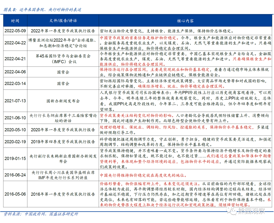 2)警惕滞胀风险:美国更接近“胀而不滞”、中国更接近“滞而不胀”、欧洲已然“大滞胀”。海外看,3月美国CPI同比8.5%,续创近40年来新高;4月欧元区CPI同比增7.5%,续创有数据以来新高,3月PPI同比高达36.8%;且考虑到俄乌冲突导致欧洲能源短缺情况加剧,后续欧洲经济下行风险将高于美国。国内看,4月核心CPI同比涨幅延续回落、且斜率扩大,叠加国内疫情散发、4月PMI再度全线回落,指向国内经济4月将进一步探底。因此,继续提示,鉴于俄乌冲突持续时间长于预期、全球能源价格高位,叠加全球经济放缓预期,全球滞胀风险仍在加剧,其中:美国更接近“胀而不滞”,中国更接近“滞而不胀”,欧洲更接近“滞胀”。3)对我国货币政策的影响:近期央行对物价的关注度提升(4.22央行行长易纲表示“中国货币政策的首要任务是维护物价稳定”、4.6国常会表示“保持经济运行在合理区间,主要是实现就业和物价基本稳定”),但实际上2018年以来通胀已非央行货币政策的核心考量(18/19年猪肉抬升CPI,21年供给抬升PPI)。倾向于认为,目前决策层提出的“稳物价”,核心考量应在避免粮食、能源、供应链的制约导致恶性通胀;当前CPI 2%左右、PPI仍处下行通道,尚不足以对货币政策形成制约。维持此前判断,我国货币政策仍将保持宽松,会更注重稳信贷、宽信用、结构性宽松,降准降息仍可期、但可能性下降,不过可能单独下调LPR。![]()
