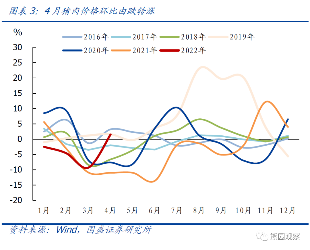 >食品项创2001年以来同期次高。4月CPI食品项环比由跌1.2%转为涨0.9%,涨幅创2001年有数据以来同期次高(仅次于2004年的1.1%)。归因看,4月食品价格由跌转涨,一方面由于疫情导致物流受阻、囤货需求增加;另一方面也和季节因素有关。重点农产品价格多数上涨,其中:由于生猪存栏下降、猪肉收储等因素提振,猪肉价格环比由3月的下跌9.3%转为上涨1.5%;便于储存的薯类、鸡蛋和鲜果涨幅较大,在5.2%-8.8%之间;蔬菜价格由涨转跌。![]()