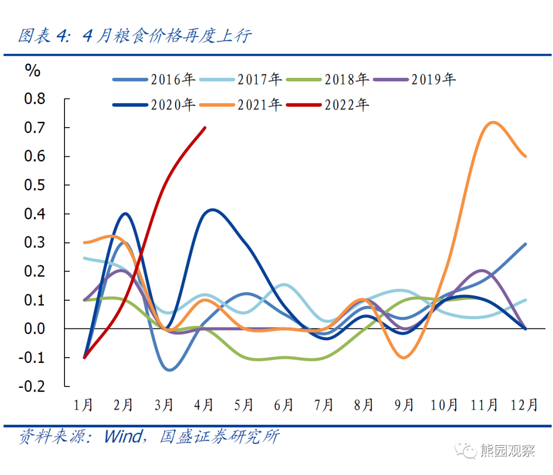 >非食品项涨幅收窄。4月CPI非食品项环比上涨0.2%,略强于季节性(2016-2019年同期均值涨0.15%);但比前值回落0.1个百分点,主因油价转降,带动4月汽油、柴油价格环比涨幅分别回落4.4、4.8个百分点至2.8%、3.0%;但由于假期影响,机票、交通工具租赁、长途汽车等出行相关消费价格季节性上涨,涨幅分别在1.5%-14.9%之间。>核心CPI涨幅连续6个月持平或回落,4月回落的斜率有所扩大。剔除食品和能源的核心CPI更能反应真实需求变化:2021年10月以来,核心CPI同比涨幅连续6个月持平或回落,4月进一步下降0.2个百分点至0.9%,指向疫情散点暴发、国内消费需求疲弱。>粮食价格环比上涨0.7%,续创近10年同期新高、有数据以来次高(仅次于2010年的1.8%)。应是俄乌冲突导致国际粮价上涨、疫情封控导致囤货需求增加两方面共同作用的结果。![]()