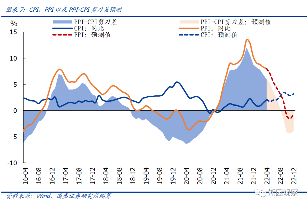 3、往后看,通胀有三大关注点:物价走势、全球滞胀风险、对政策的影响1)物价走势:“CPI上、PPI下”仍是2022基准情形,猪价、油价、疫情演变是关键>CPI:高频数据看,5月首周猪肉价格环比涨幅扩大至8.7%,鸡蛋、水果价格涨幅收窄,蔬菜价格降幅扩大,预计5月CPI食品分项可能稳中小降。非食品项中油价可能小升,服务价格大概率转降、且受疫情影响预计仍会弱于季节性。因此,预计5月CPI环比可能持平或小降,同比预计仍将维持2.0%左右。全年看,维持此前判断:后续CPI上行的幅度主要取决于生猪去化、疫情以及油价等,基准情形下全年中枢可能在2.2%左右。>PPI:高频数据看,5月首周南华工业品指数、CRB现货指数分别环比下跌1.6%、2.3%,原油、螺纹钢价格分别环比涨1.8%、1.3%。往后看,考虑到疫情好转、复工复产、地产放松、基建发力等因素,预计5月PPI环比持平或者小升;同比大概率延续回落。全年看,继续提示关注油价的不确定性,基准情形下如果全年油价中枢维持95美元/桶左右,国内大宗价格总体可控,预计2022年PPI中枢约为4.3%左右。![]()