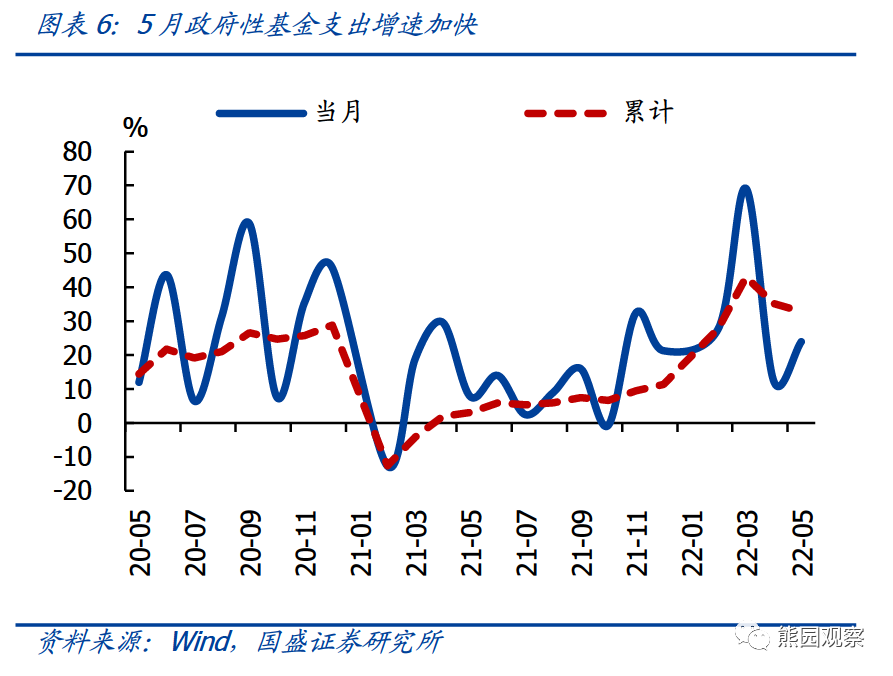 >一般财政支出节奏再加快,基建是主要拉动项,尤其是政策推动的交通运输。5月一般财政支出1.81万亿,同比增速由4月的-2%转为正增5.7%,但仍低于3月的10.4%。从支出进度来看,5月完成全年预算的6.8%,与近两年基本持平。主要分项看,民生方面,卫生健康支出增速小幅回落0.7个百分点(应与疫情好转有关),教育、社保支出增速分别抬升13.1和1.1个百分点;基建方面,支出增速抬升至6.6%(4月3.9%),其中:交通运输相关支出增速大幅抬升37.3个百分点至29.6%,是主要拉动项,城乡社区事务、农林水支出增速分别为-7.8%、8.6%;债务付息支出增速大幅抬升至45.7%,指向债务付息压力仍然较大(据我们测算,年内仍有0.65万亿左右的待支付利息)。