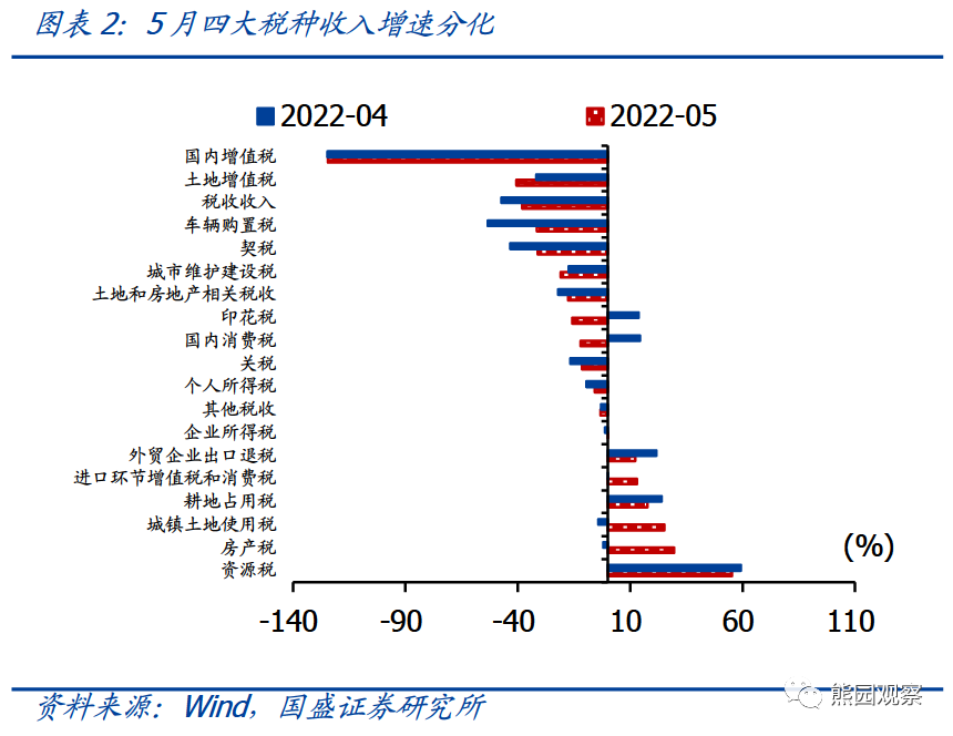 >税收收入中,四大税种表现分化,土地和房地产相关税收连续2个月负增长。四大税种中,增值税同比-124.4%,连续两月大幅负增(4月-124.7%),主因留抵退税;个人所得税同比-5.7%,连续3个月负增(上一次出现连续3月负增是在2020年疫情期间),也从侧面反映就业压力仍大;消费税同比由正转负为-12.1%,可能与汽车销量持续下滑拖累相关税收有关,成品油相关税收贡献下降也有一定影响;企业所得税由负转正至0.3%,可能与疫情边际改善有关。土地和房地产相关税收同比-17.5%,连续2月负增长,指向房地产市场仍然低迷。