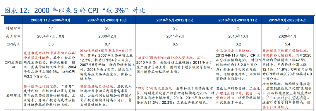2)历轮CPI“破3%”的影响。我们在中期报告中,详细梳理2000年以来5次CPI突破3%的情形(详见图表8、图表9),分别是2003年11月-2005年3月、2007年3月-2008年10月、2010年5月-2012年5月、2013年9月-2013年11月、2019年9月-2020年4月。其中:前3次CPI走高主要源于流动性、需求、供给等多重因素共同作用,期间期间《货币政策执行报告》均强调要“控制通胀预期,保持物价基本稳定”,并多次提高存款准备金率、基准利率;后2次中第4次持续时间偏短(仅3个月),货币政策未明显收紧;第5次主要由供给因素驱动(猪肉),叠加疫情:影响,央行只是强调“防止通胀预期发散”、“保持物价水平基本稳定”,期间多次降准、降息,稳定宏观经济大盘。当前看,下半年CPI可能阶段性“破3%”,但对货币政策影响预计有限,主因有三:>时间&高点:本轮CPI破3%持续时间可能偏短、且向上幅度有限,基准假设下在6个月内;>宏观环境:2022下半年经济可能边际恢复、但仍将偏弱,跟前3轮的经济过热存在差异;>驱动因素:本轮CPI破3%主要源于供给因素(猪周期、原油价格),需求端仍然偏弱。![]()
