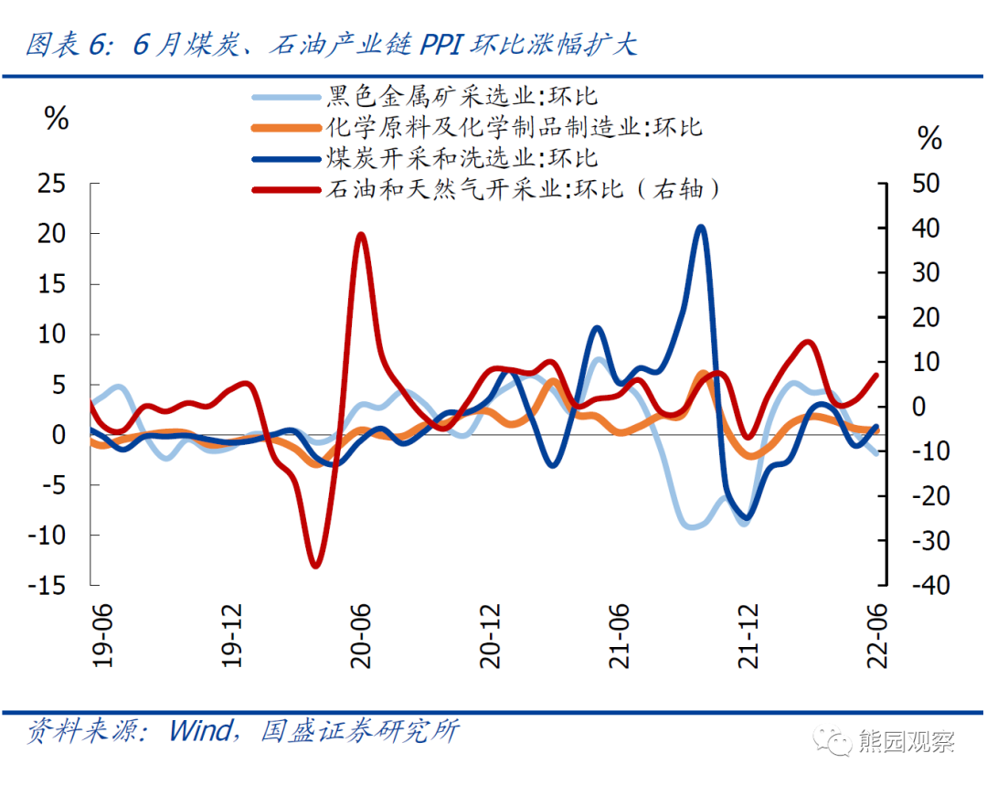 >分七大产业看:上游采掘、原材料价格环比涨幅扩大,中下游产业多数环比涨幅收窄。具体看,上游采掘、原材料价格环比涨幅分别较前值扩大2.0、0.2个百分点至1.9%、0.3%,中游加工工业、下游耐用消费品价格降幅扩大0.5、0.2个百分点至-0.4%、-0.1%,食品、一般日用品价格环比均收窄0.1个百分点至0.5%、0.1%,衣着价格环比扩大0.2个百分点至0.7%。>分40个工业行业看:6月多数行业环比涨幅收窄,其中:涨幅扩大的行业主要集中在煤炭、原油产业链,涨幅回落较多的行业主要是黑色、有色、非金属矿物等。具体看:1)原油:6月国际油价续涨5.0%,带动PPI油气开采、燃料加工、燃料加工环比扩大5.7、2.7、1.4个百分点至7.0%、3.6%、2.2%,但PPI化工制造涨幅收窄0.2个百分点至0.4%;2)煤炭:由于迎峰度夏、煤炭需求增加,PPI煤炭采选环比由5月的下降1.1%转为上涨0.8%;3)钢铁:螺纹钢现货价环比跌幅扩大3.3个百分点至7.0%,带动PPI黑色冶炼行业环比降幅由0.5%扩大至3.1%,产业链上游的PPI黑色采矿环比由上涨0.3%转为下跌1.9%;4)有色:相比5月,6月铜价跌幅扩大、铝价跌幅收窄,带动PPI有色冶炼行业环比跌幅扩大0.8个百分点至2.1%,产业链上游的PPI有色采矿环比由上涨0.4%转为下跌0.8%;5)燃气:6月国内液化天然气价格降幅扩大7.6个百分点至12.2%,带动PPI燃气生产供应行业环比由持平转为下跌0.3%。![]()
