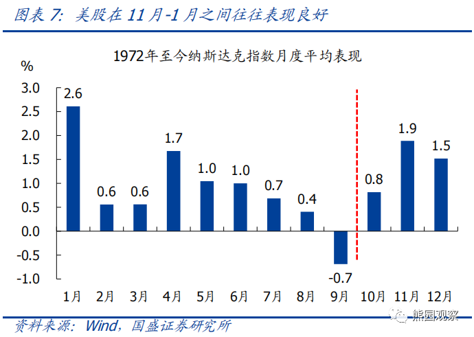 >美股展望:前期报告中我们曾指出,美股存在明显的季节性规律,8月和9月往往是美股表现最差的月份,10月通常会有所好转,而11月至次年1月往往是美股表现最好的时间段。再结合市场有望重新交易流动性宽松,看到明年初,美股大概率会阶段性反弹,对流动性更敏感的纳斯达克指数有望取得更好的相对表现;再往后看,根据历史经验,美股通常在经济衰退前1-4个月开始下跌,直到经济复苏前2-5个月才会触底,这意味着明年1月之后美股大概率还会有一轮调整。
