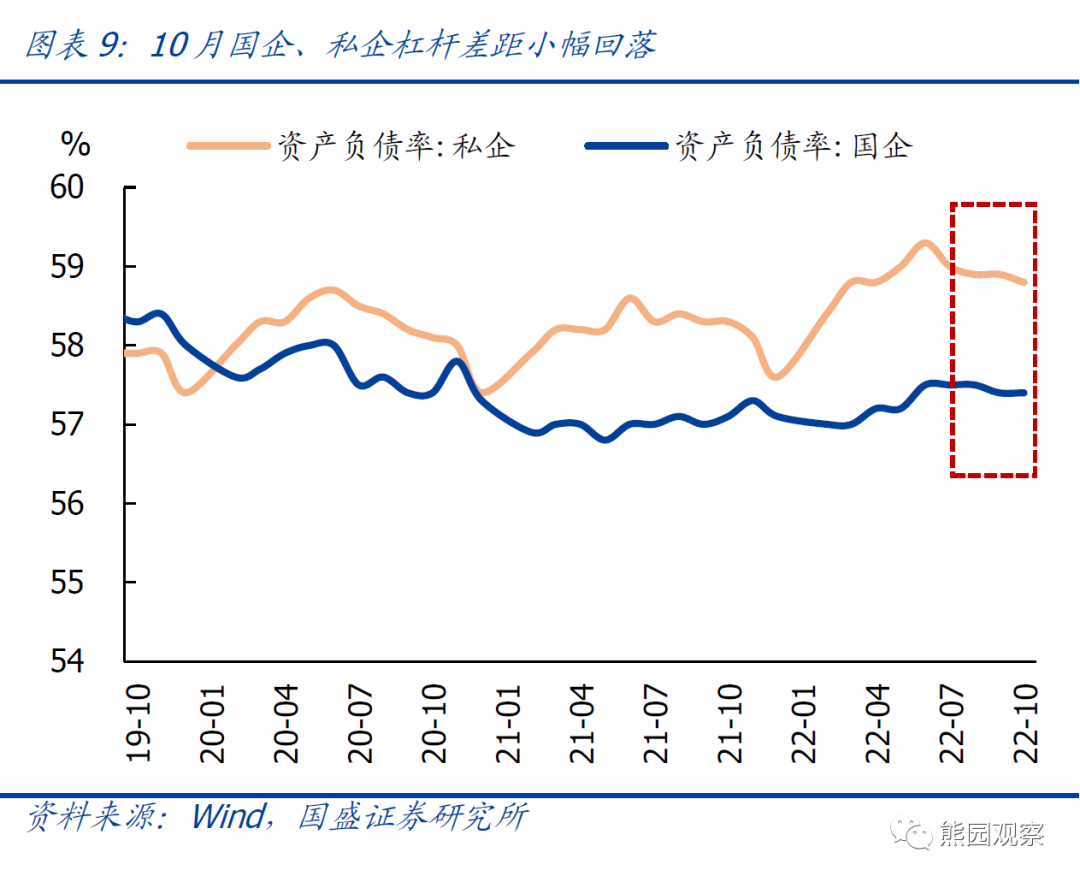>杠杆率看:截至10月底,企业杠杆连续4月持平,国企、私企差距再度收敛。