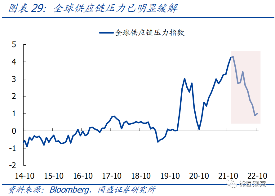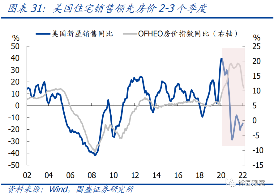 服务通胀的核心是住宅分项,美国CPI住宅分项在整体CPI中的权重约为三分之一,在服务分项中的权重接近60%。住宅分项主要包括房租和自有住房等价租金两个细分项,可将其统一视为房租的概念。前期报告中我们曾介绍过美国地产的分析框架,即:住宅销售与利率水平高度负相关,住宅销售同比领先房价同比2-3个季度,房价同比领先CPI住宅分项同比4-5个季度。随着美国利率水平走高,美国住宅销售同比自2020Q4以来持续下滑,并已连续16个月负增长;美国房价同比从2021Q3转为高位震荡,并从2022Q1开始回落。根据历史领先规律推算,美国CPI住宅分项同比将在2023Q2迎来拐点,随后将在至少一年内持续下降,届时美国通胀压力将实质性缓解。![]()