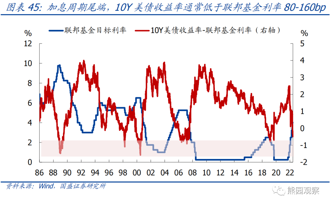 目前美国经济已明显走弱,通胀已开始加快回落,放慢加息的预期也已形成,因此美债收益率的下行趋势大概率已经确立。前期报告中我们曾指出,历轮加息周期的尾端,10Y美债与联邦基金利率往往会出现倒挂,倒挂幅度在80-160bp,若美联储在2023年3月加息至4.75-5.0%,则届时10Y美债收益率大概率处在3.2%或更高水平。截至2022年12月初,10Y美债收益率已经降至3.6%左右,这意味着2023年3月之前进一步下行的空间不大,需要等到降息预期开始升温之后才会加快下行。基于前文对美国经济、通胀、货币政策的判断,并结合历史规律,我们认为2023年10Y美债收益率将整体保持下行趋势,节奏上二三季度可能下行最快,四季度下行节奏将有所放缓、并可能出现反弹。![]()