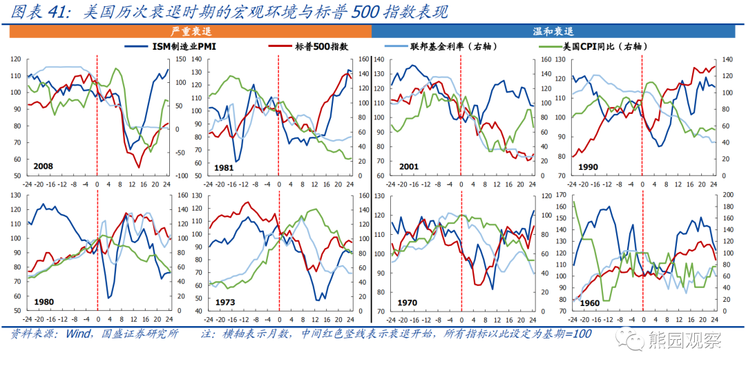 根据前文分析,2023年海外整体宏观环境是:经济温和衰退、通胀大幅回落、货币政策转向。在此背景下,国债面临三重利好;而对于其他资产而言,三方面因素的影响效果不同、且互相存在牵制,因此走势会更加不明朗。我们认为,2023年海外大类资产配置的关键是择时,即根据经济衰退与货币政策转向的演绎节奏来选择买入或卖出的时点,胜率比赔率更重要。下文中,我们将结合历次衰退时期的资产表现规律,并根据当前具体情况,对海外主要大类资产走势进行展望。经济衰退会导致美股盈利恶化,而衰退引发的货币政策宽松则会对美股估值形成提振,美股最终表现取决于这两股力量的相对强弱。图表41汇总了美国历次衰退时期的标普500指数走势,从中可以看出三点规律:1)美股触顶时间通常领先于衰退,但领先时间不固定,短则一个月,长则一年左右。而当衰退发生后,美股都会继续下跌。2)严重衰退时期,美股触底时间通常与美国PMI触底同步或略微滞后;温和衰退时期,美股触底通常领先PMI触底,领先时间在1-4个月不等。唯一的例外是2001年,当时互联网泡沫的高估值导致美股在衰退后持续下跌了两年,而目前美股估值已降至低位,与2001年的情况并不相同。3)除2001年之外,其他三次温和衰退中,在衰退发生一年后,标普500指数的点位均高于衰退前的点位(注意不是创新高)。![]()