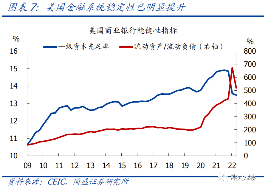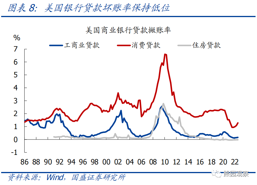 >金融系统稳定性方面:截至2022Q2,美国存款机构一级资本充足率为13.5%,明显高于2008年的10%左右;流动资产与流动负债的比值为519%,大幅高于2008年的80%左右。金融系统稳定性之所以明显提升,主要原因是2010年美国推出了《多德-弗兰克法案》,大幅提高了金融监管要求,也迫使银行提高了信贷准入门槛,贷款质量得到大幅改善。2010年之后,美国各类银行贷款的坏账率始终保持低位,即使2020年疫情爆发后的经济严重衰退时期,银行贷款坏账率也并未明显抬升。综上分析,由于企业债务风险较高且已开始释放,美国经济大概率会发生衰退;但由于居民部门债务风险很低,同时金融系统稳定性明显提升,本轮美国经济衰退程度大概率会较为温和。![]()