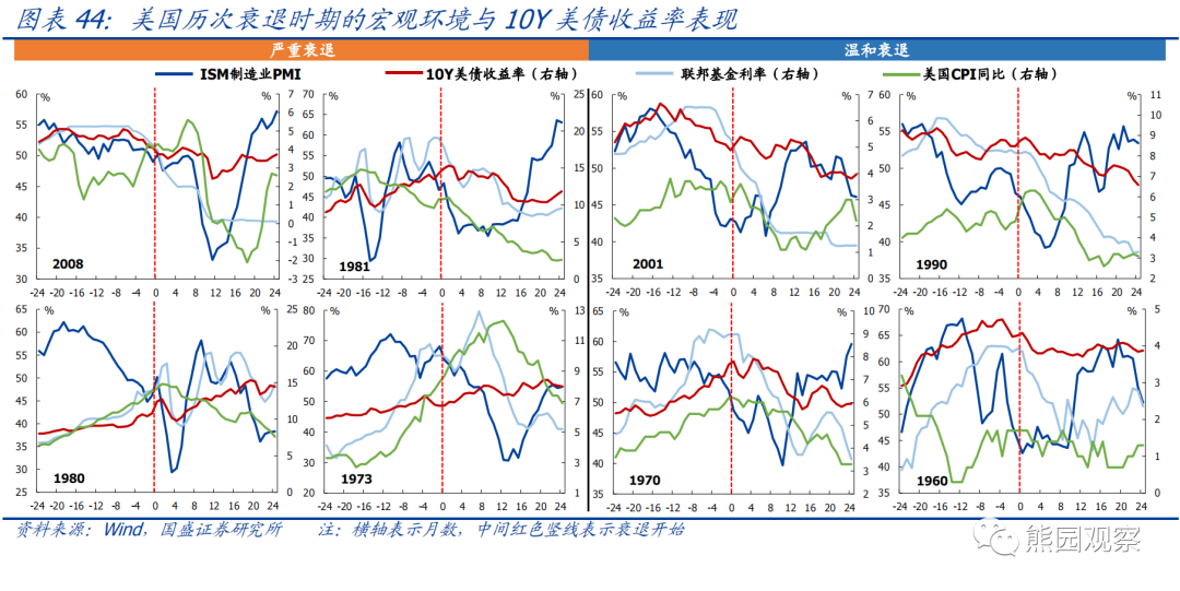 美债收益率主要受经济、通胀、货币政策影响,其走势取决于这三股力量的相对强弱。图表44汇总了美国历次衰退时期的10Y美债收益率走势,从中可以看出三点规律:1)10Y美债收益率顶部通常与停止加息时点同步或略微提前,唯一的例外是1970年,当时通胀在停止加息后继续抬升至6%以上,10Y美债收益率在降息开始后才触顶回落。2)衰退开始后,10Y美债收益率几乎都表现为下行,唯一的例外是1973年,当时通胀在衰退后继续抬升了一年,并且高点超过12%,导致10Y美债收益率也随之上行。3)当PMI触底反弹时,若降息已经停止,或通胀下降速度趋缓,则10Y美债收益率会随PMI一起反弹;但若降息仍在继续,或通胀仍在快速下降,则10Y美债收益率仍会继续下行,不会跟随PMI反弹。![]()