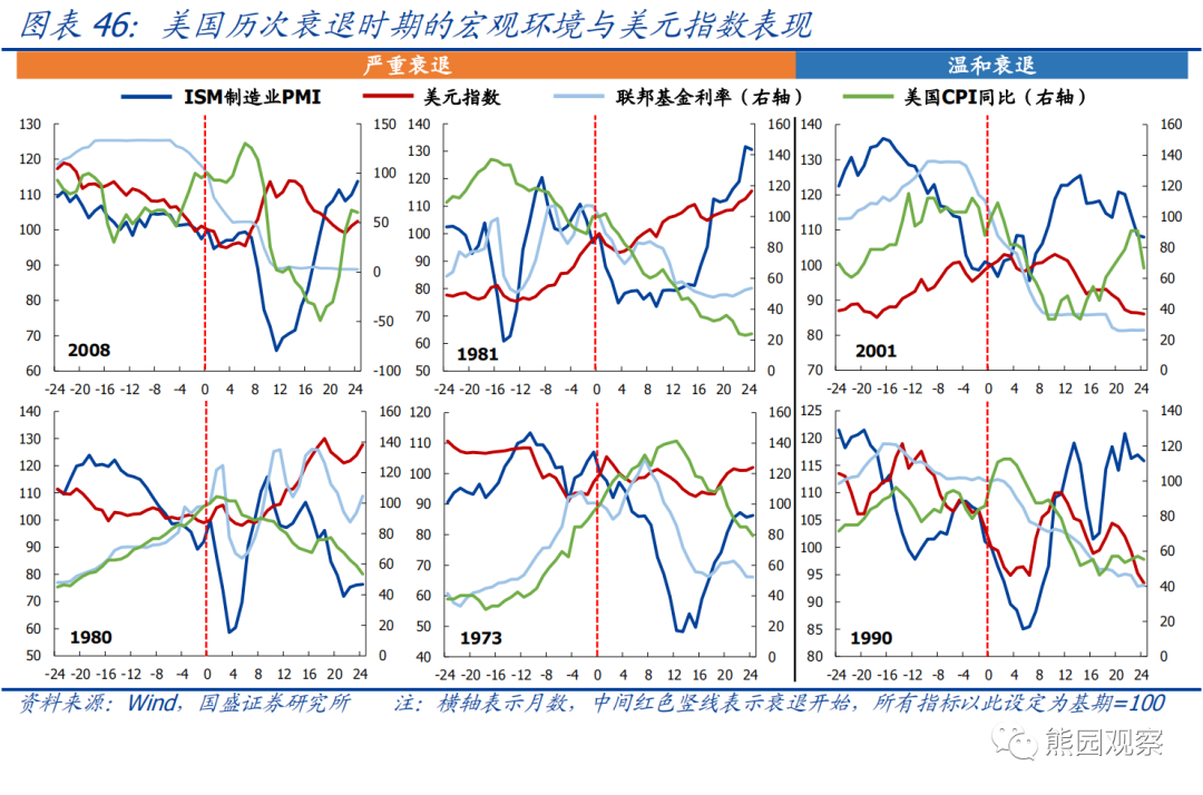 美元指数的核心影响因素是美欧经济与货币政策的相对表现,而人民币汇率的方向基本由美元指数决定,幅度会受到中国出口、中美关系等因素的影响。由于1970年之前仍处在布雷顿森林体系,美元与黄金价格保持固定,因此在梳理衰退时期的美元与黄金表现规律时不包括1960年和1970年衰退。图表46汇总了美国历次衰退时期的10Y美债收益率走势,从中可以看出两点规律:1)衰退前的美元指数走势无一致规律,衰退发生后半年左右,美元指数通常表现为下跌。背后的原因在于,美国经济通常领先于全球经济,同时美联储货币政策也通常领先于其他央行,因此在衰退发生之初,美国经济相较其他国家往往表现更弱、货币政策也相对更宽松。2)衰退后的美元指数走势与美国PMI走势高度正相关,PMI触底反弹后美元指数往往也会触底反弹。唯一的例外是2008年,当时由于金融危机导致美元流动性快速收紧,即使PMI大幅下降,美元指数也出现快速飙升;而等到PMI开始回升后,美联储推出了量化宽松政策(QE),美元指数也因此再度下跌。前期报告中我们曾指出,3月以来美元指数持续大幅走高,主要是在交易欧洲能源危机,但实际上,由于市场对欧洲前景十分悲观,目前为止欧洲经济并未比美国更加不及预期,同时欧央行紧缩节奏也并未弱于美联储,基本面因素难以支撑美元继续大幅上涨。目前看来,欧洲天然气储备至少可度过冬季,美国经济已非常接近衰退,美联储也大概率会放慢加息,因此11月初以来美元指数已经开始回落。我们认为,2023上半年美元指数大概率延续回落,下半年随着美国经济触底回升,美元指数也可能止跌反弹。需要提示的是,俄乌冲突、欧洲能源危机的前景仍不明朗,因此美元指数走势存在较高的不确定性。由于美元指数先跌后涨,2023年人民币汇率大概率先升后贬,但升值空间可能不会太大,主要有两方面的制约:一是2023年全球经济衰退将导致中国出口明显放缓,从而企业结汇需求会减少;二是美国中期选举中过后民主党失去众议院多数席位,拜登难以推行内政,只能在外交方面发力,中美关系可能会出现不利变化。![]()