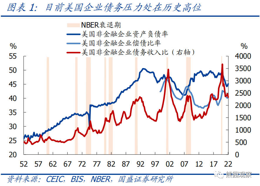 回顾2022年,海外市场的三个关键词分别是“通胀”、“加息”、“能源危机”。在这一年,全球主要经济体经历了数十年来最高的通胀水平,主要央行开启了史上最快的加息进程,俄乌冲突使欧洲陷入严重的能源短缺。各种因素共同作用下,全球股市暴跌,美元指数、债券收益率、能源价格飙升,市场对经济前景愈发悲观,对经济衰退的讨论日渐增多并已基本成为共识。展望2023年,海外市场最大的关键词将会是“衰退”,如果再加一个,则应是“宽松”。我们认为本轮全球经济衰退不可避免,但无需对此太过悲观,因为本次衰退程度大概率较为温和,且持续时间较短。伴随经济衰退,全球通胀也将出现大幅回落,主要央行将逐步停止加息并转为降息,全球流动性将重回宽松。在这一环境下,把握衰退与宽松的演绎节奏并据此进行宏观择时,将成为大类资产配置的重中之重。本篇报告中,我们重点分析了本轮全球经济衰退的程度、时间、节奏等内容,并对历次衰退时期的经济状况、货币政策、资产表现规律进行了详细复盘,以期成为2023年的“衰退交易手册”。美国经济是否衰退取决于企业债务,衰退程度取决于居民债务和金融系统稳定性。关于美国经济衰退的界定,较为权威的是美国国家经济研究局(NBER)的公布结果,NBER会综合衡量各类经济指标的表现来确定经济是否衰退,但不存在一个明确的量化标准。前期报告中我们多次指出,经济衰退或经济危机的本质是债务危机,当企业或居民爆发大规模债务违约时,资金链会发生断裂,进而引发流动性快速收紧和融资环境显著恶化,未发生违约的实体也会受影响,结果是大量企业破产、大量员工失业、经济陷入衰退。从美国的历史经验来看,企业债务违约往往是经济衰退主要导火索,居民部门大量违约的情况较为少见。在违约爆发过程中,若同时叠加金融系统不稳定,就会出现大量金融机构倒闭,引发系统性金融风险,将在很大程度上放大衰退的严重程度。概括而言:企业债务风险高+居民债务风险高+金融系统脆弱=严重衰退,例如2008年金融危机;企业债务风险高+居民债务风险低+金融系统稳定=温和衰退,例如2001年互联网泡沫。衡量债务压力的指标主要有三个,分别是资产负债率、债务收入比、偿债比率,其中债务收入比是指存量债务与当期税前收入之比,偿债比率是指当期还本付息额与税前收入之比。衡量金融系统稳定性主要可通过两个方面,一是资本充足率,二是流动性比率。目前美国这些指标的表现如下:>企业债务方面:截至2022Q2,美国非金融企业资产负债率处在1990年以来的中位数水平;债务收入比是历史第三高,仅低于2001年和2020年疫情时期;偿债比率略高于疫情前,且高于1999年以来的趋势性水平。需注意的是,美联储是从6月才开始连续加息75bp,当前企业债务压力应当比2022Q2时更严峻。实际上,年初以来美国企业债已开始出现大量违约,2022年1-9月,美国企业债累计违约规模高达217亿美元,是2021全年违约规模的5.5倍,单月违约规模更是已逼近2020年疫情之初的高点。与此同时,企业债信用利差也开始快速走阔,目前已达到历次衰退前的水平,表明融资环境已明显恶化。往后看,2023年3月和5月将迎来美国企业债到期高峰,随着美联储持续加息和盈利放缓,企业债违约规模大概率将进一步增加。![]()
