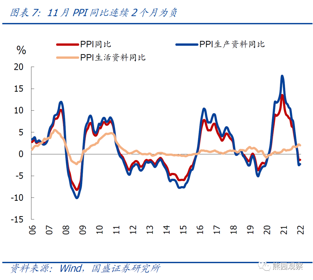 2、11月PPI同比持平-1.3%,降幅低于预期1.5%,主因原油等价格跌幅小于高频数据;翘尾、新涨价因素分别影响-1.2、-0.1个百分点,持平前值;环比续涨0.1%、涨幅收窄0.1个百分点,但仍强于季节性(2011-2019年同期均值0.0%)。具体看:>分生产&生活资料看:11月生产资料价格环比由上涨0.1%转为持平,基本符合季节规律(2011-2019年同期均值为-0.04%);生活资料涨幅收窄0.4个百分点至0.1%,指向疫情反复背景下,下游需求偏弱对生活资料的生产亦有拖累。![]()