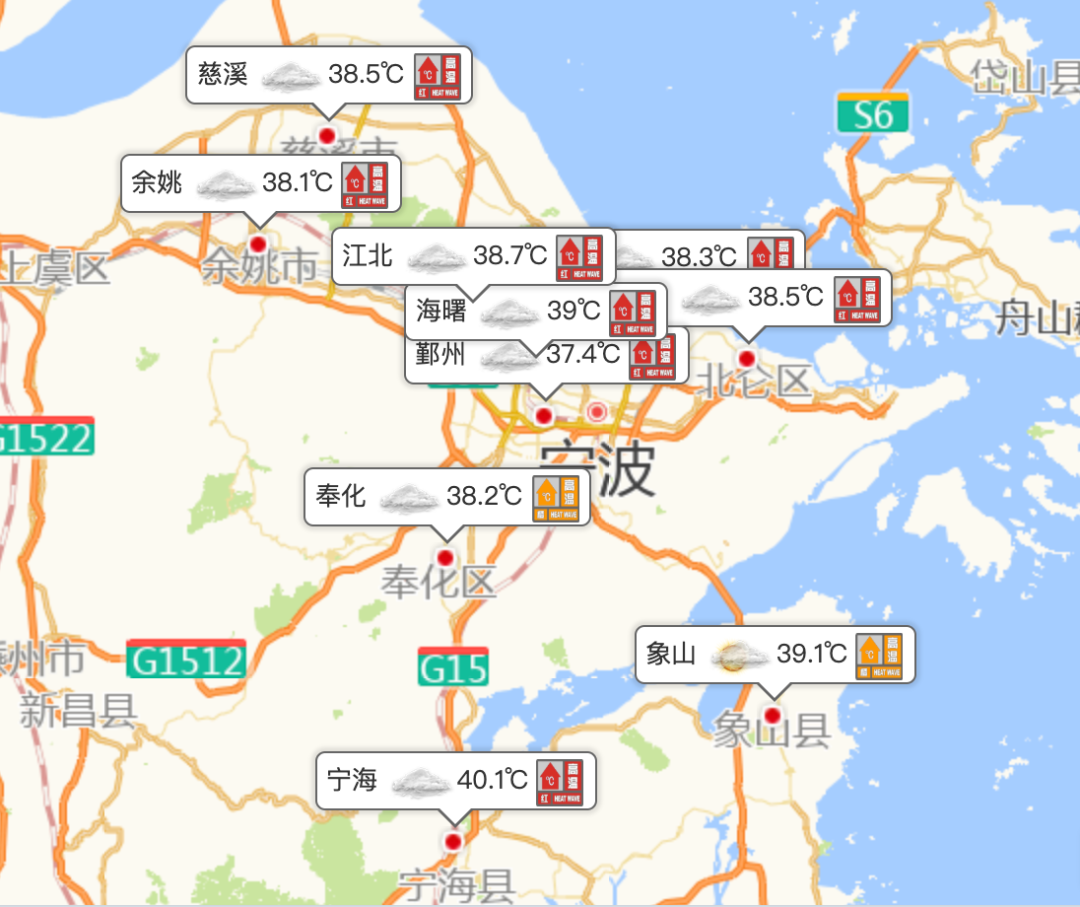 截至10时35分,鄞州区、余姚市、慈溪市、江北区、宁海县、海曙区、镇海区、北仑区发布高温红色预警信号,奉化区、象山县发布高温橙色预警信号。