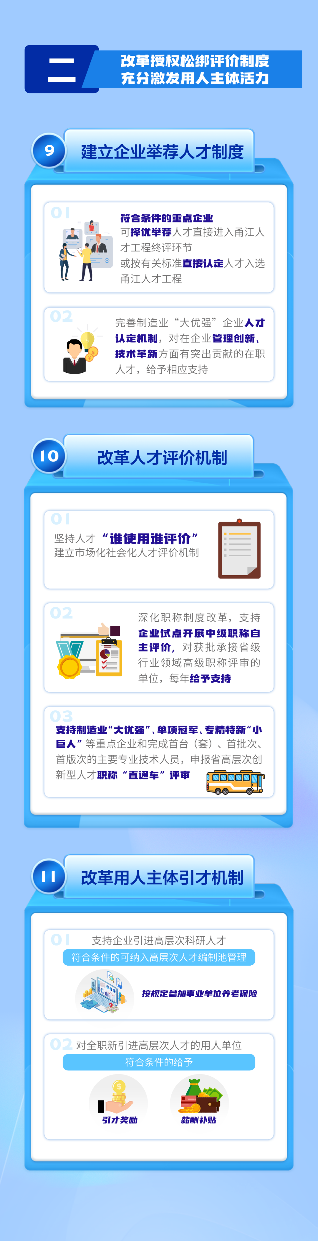 一是创新突破类,主要包括设立医疗高端人才团队项目支持、青年科技人才项目支持,给予甬江实验室等新型创新平台人才认定自主权,以及完善制造业“大优强”企业人才认定机制等举措。