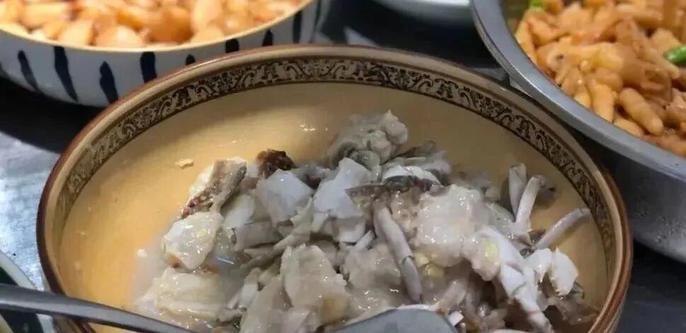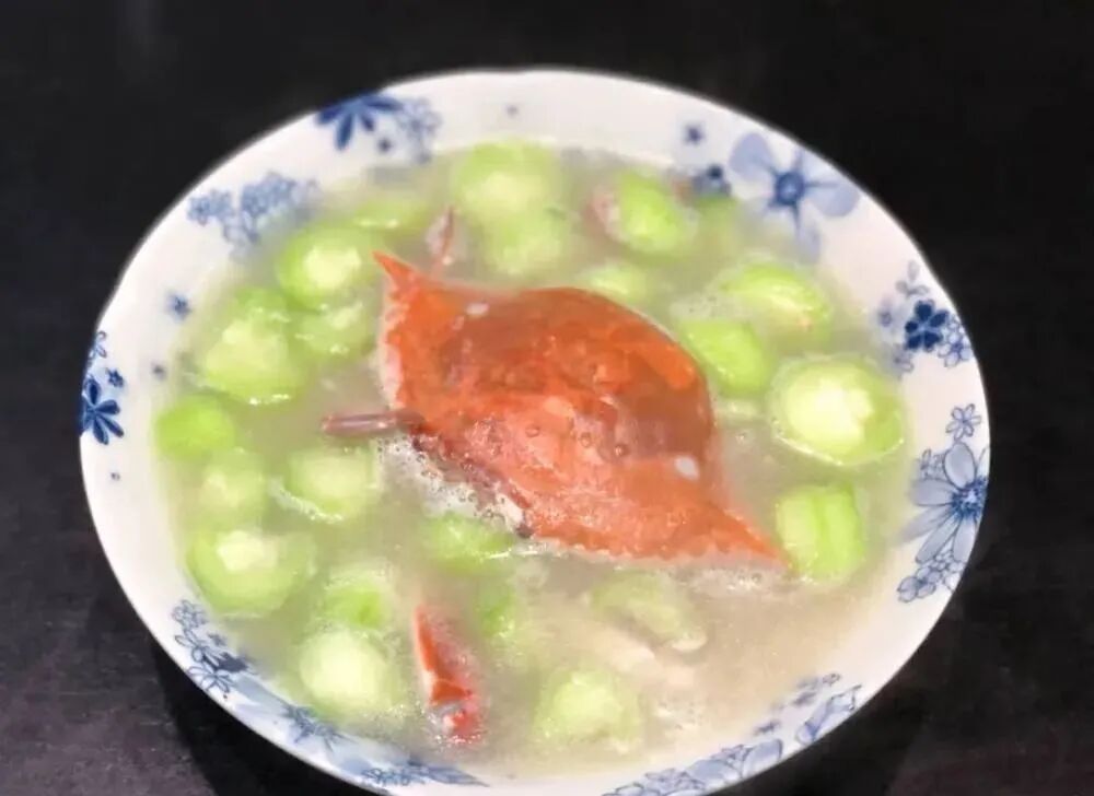 煮蟹羹也是极美妙的家常吃法。白蟹开捕季也是茭白、丝瓜、小青菜、土豆等时蔬上市时。羹类菜在宁波人餐桌上占有重要位置。鲜活白蟹煮时蔬,两种鲜味融入汤水,勾芡后,时蔬的鲜渗入蟹肉,口味变得丰富;汤羹中混入蟹黄、蟹肉这些珍馐,口味早已升华,非寻常菜羹所能比拟。