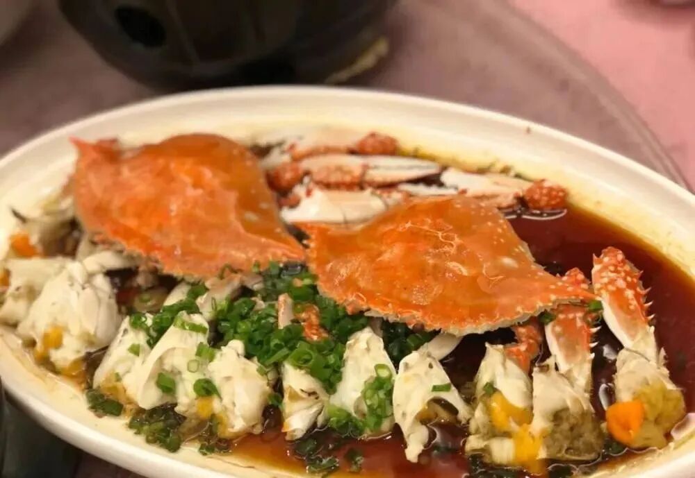葱油这种家常烹饪法同样适用于白蟹,白蟹切块摆盘蒸熟后,浇上热葱油,葱绿蟹红,有一种小家碧玉的既视感。