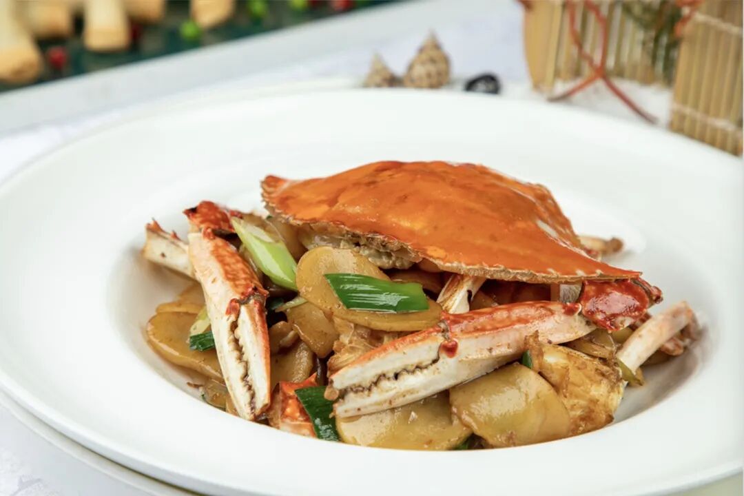 白蟹炒年糕制作精细,选料讲究,成品的年糕软中带韧,蟹味浓郁,香气扑鼻,蟹鲜味美,是菜品和主食两者兼顾的好产品。