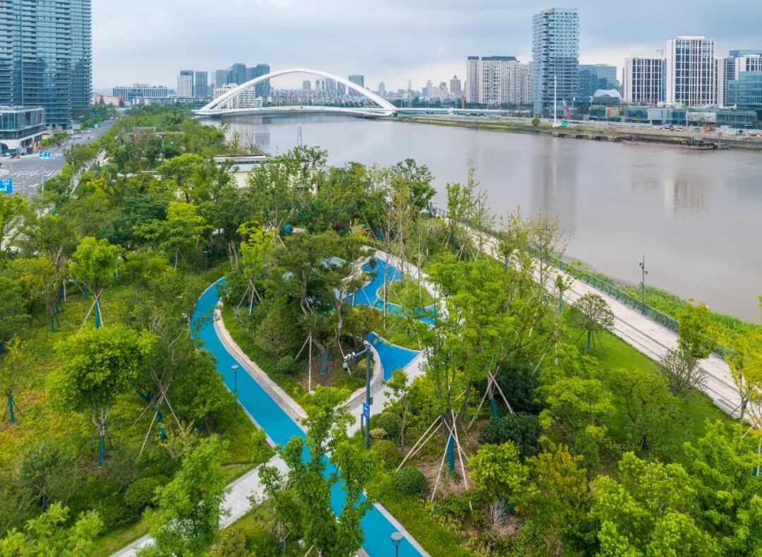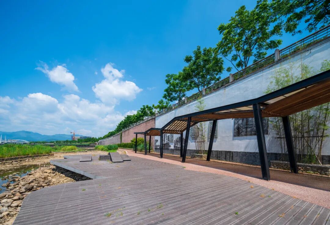 新典路以南(奉化江)滨江绿道位于新典桥以南,段塘碶闸以北,是浙江省级绿道6号线的组成部分,全长1.8公里,沿江布置了城市阳台”“记忆广场”“活力空间”“段塘往事”“江河溯源”“江滩古渡”六大景观片区,设置了“可走、可跑、可骑”的慢行系统,打造了舒适自然的滨水绿道空间。