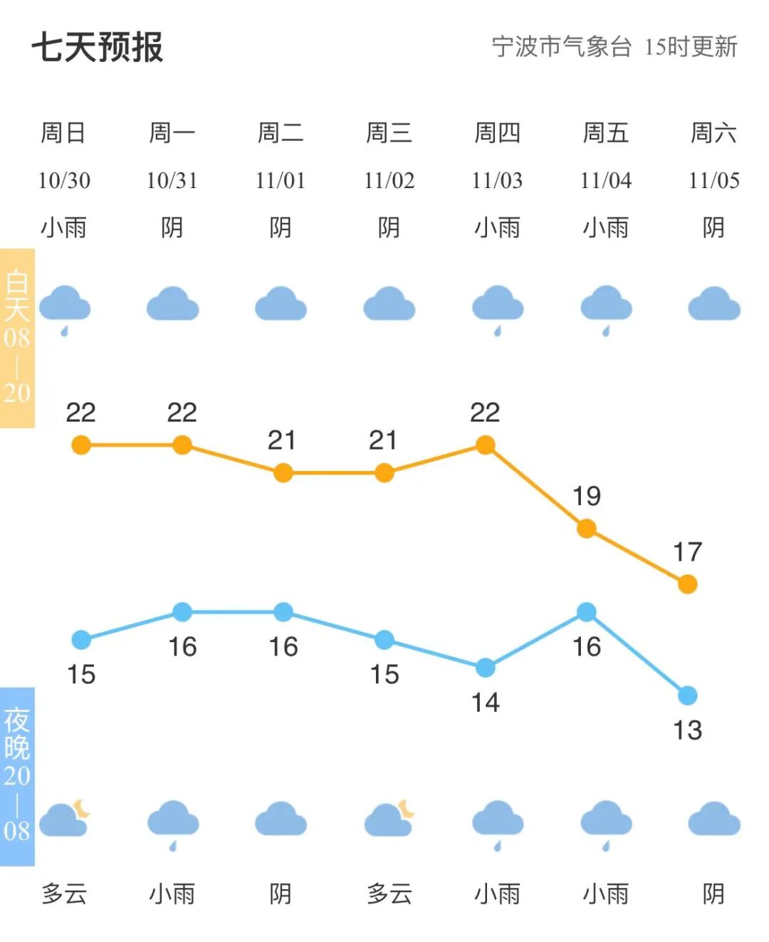 今晨的阳光比昨天更好了些,但是在浅秋进入深秋的道路上,冷空气是不会闲着的,此外,今年第22号台风“尼格”的外围影响仍在持续。具体来看↓据浙江省气象台预计:10月31日-11月1日,又有一股弱冷空气扩散南下,到时候会有一次降温过程,主要体现在最低气温上,早晨的最低气温会从之前徘徊在15℃以上的区间,跌落至10℃出头,早晚寒凉感加重。冷空气并未就此罢休,3日后期至5日,受弱冷空气扩散影响,气温再次回落,过程降温幅度4℃左右。提醒小伙伴们,要注意添衣保暖,小心感冒。![]()