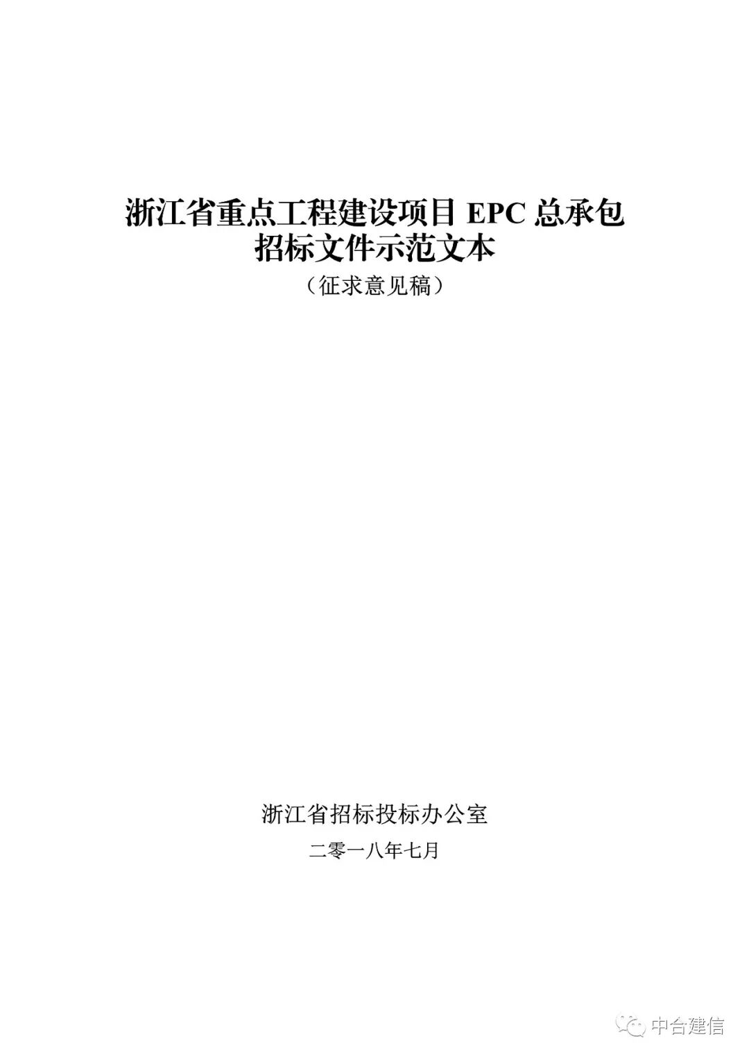 2018年9月13日,浙江省招标投标办公室发布的《浙江省重点工程建设项目EPC 总承包招标文件示范文本(征求意见稿)》
