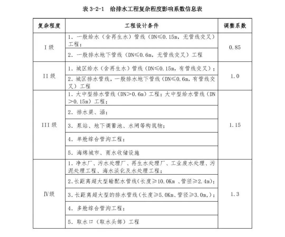 表3.市政工程设计复杂程度影响系数及成本附加系数信息表