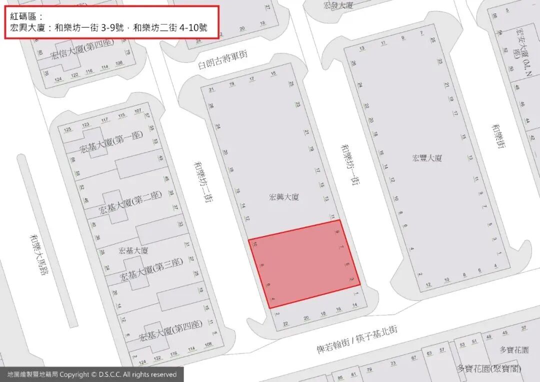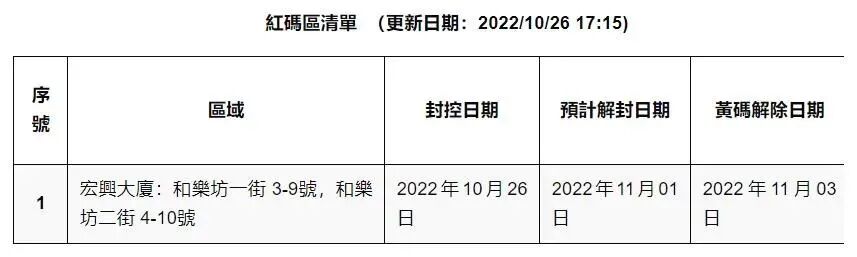 当局公布最新红码区清单。截至昨日下午5时15分,宏兴大厦列为红码区,预计解封日期11月1日,黄码解除日期11月3日。
