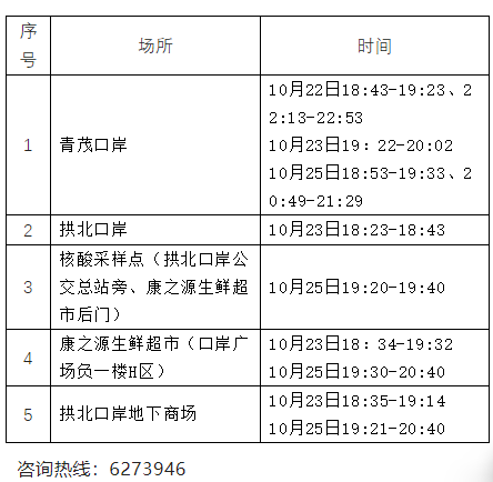 应新冠疫情防控需要,请以下时间段到过相应场所的市民尽快向所在社区(村)、单位或酒店报备,主动进行核酸检测“三天三检”及自我健康监测,如出现不适请及时就医。