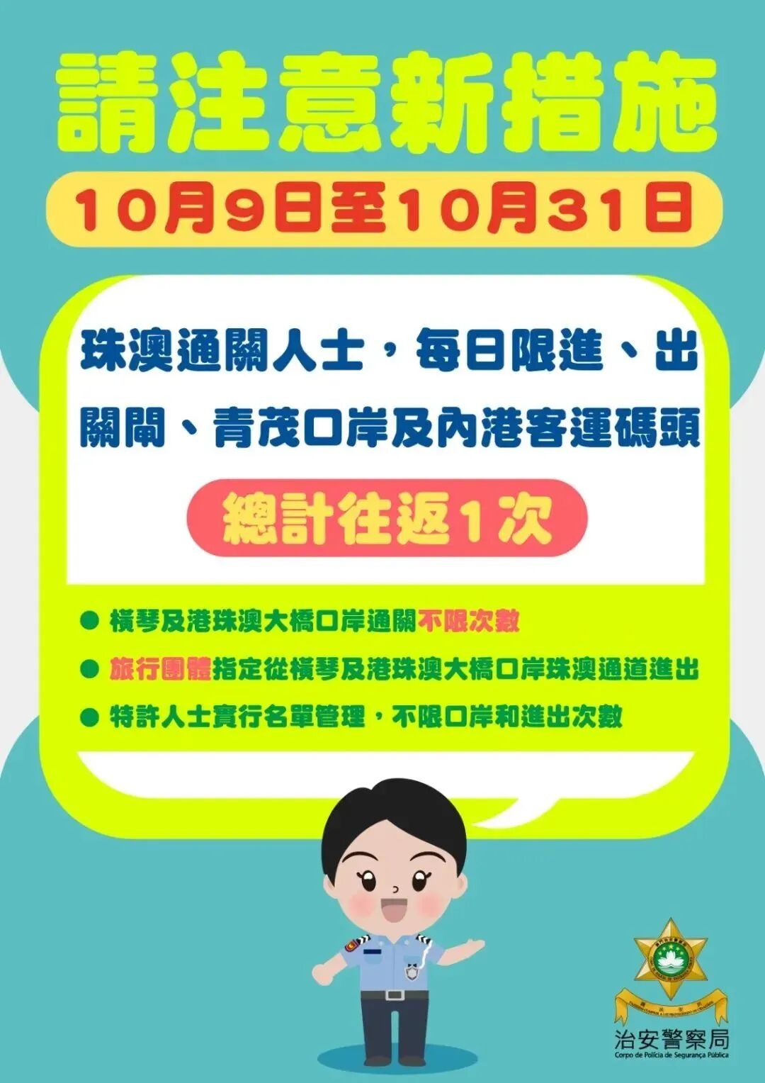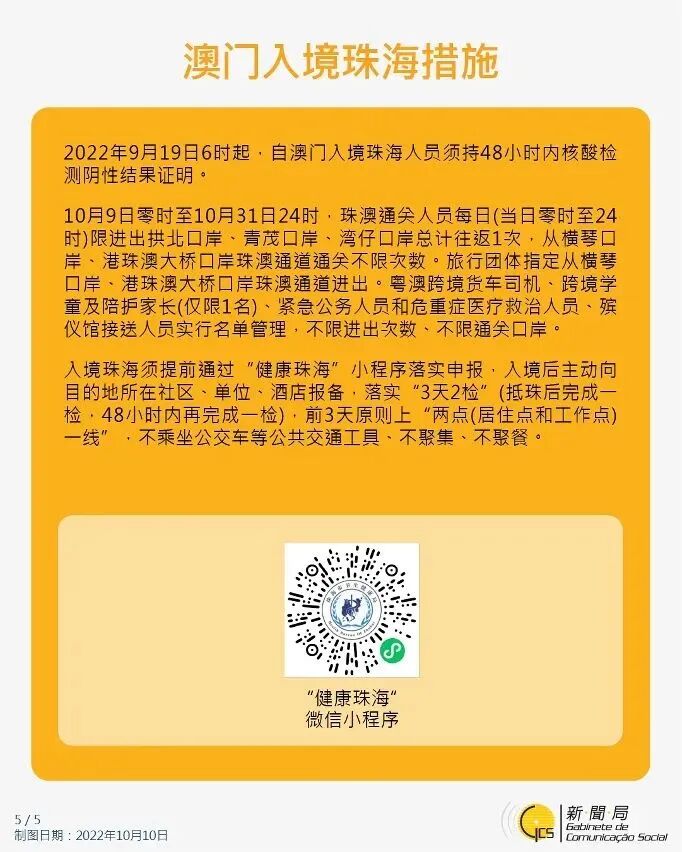 一、珠澳口岸通关场所限次通行措施暂定再延长,从2022年10月9日凌晨零时至10月31日晚上12时。