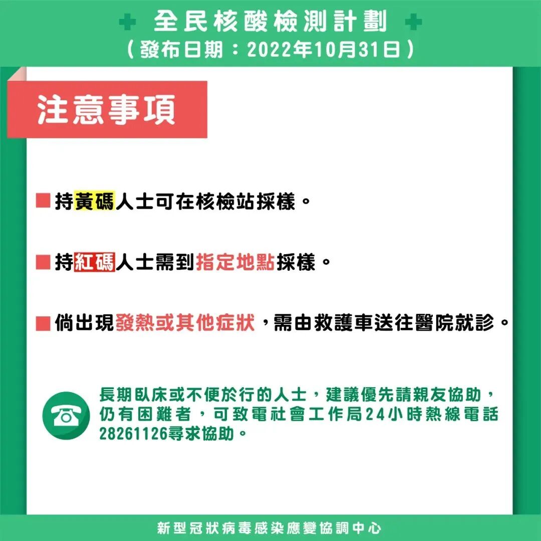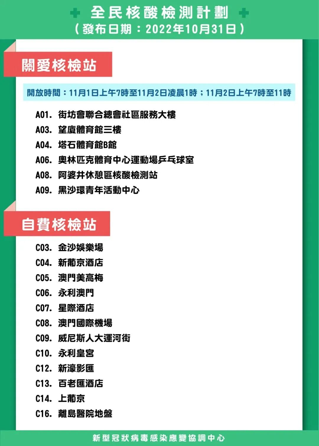 澳门应变协调中心公布,11月1日(星期二)上午7时至11月2日(星期三)上午11时,进行全民核酸检测