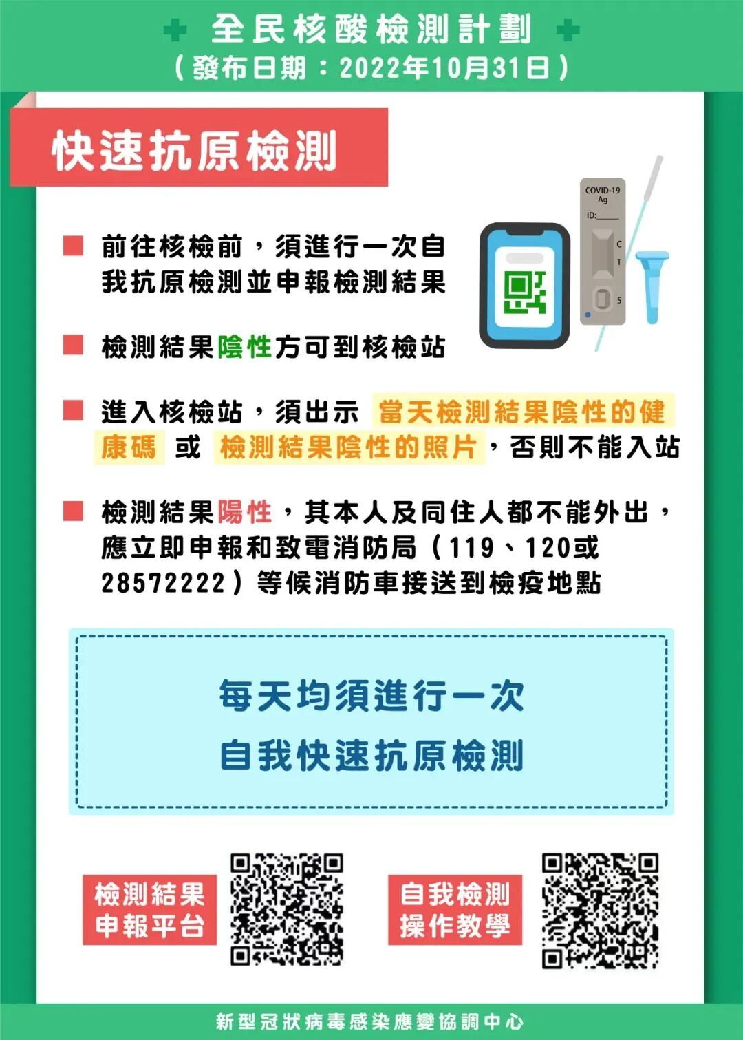 重点区域人士出门前须进行一次快速抗原检测并透过澳门健康码申报检测结果,检测结果为阴性方可到核检站进行核酸检测。若检测结果为阳性,除在澳门健康码作出申报外,不论是否有发热、呼吸道症状等不适,应尽快召唤救护车(电话:119、120或+853 2857 2222),本人及同住人必须留在家中耐心等候当局安排的救护车运送至检疫地点,当局会统一安排进行核酸检测。
