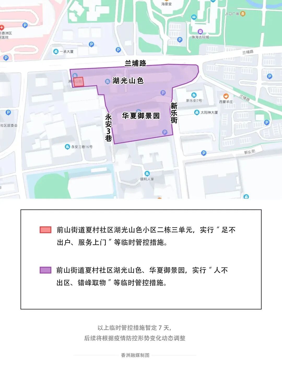 一、前山街道莲塘社区明珠南路3045号、夏村社区湖光山色小区二栋三单元,实行“足不出户、服务上门”等临时管控措施。