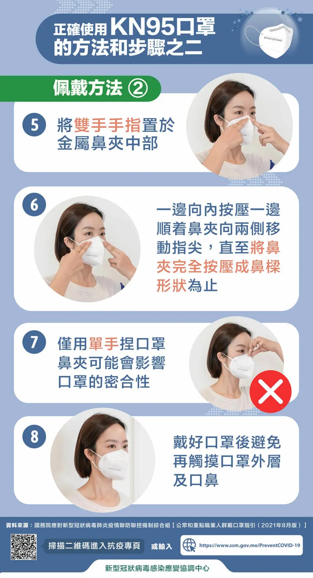 严密合 金属条一侧在上,按压金属条使之紧贴鼻梁,使口罩与面部紧密贴合,口罩要遮盖鼻、口和下颌。