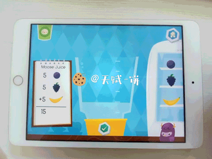 场景一:果汁店这个场景下的游戏就是榨汁,各种花式榨汁,融入了数字认知,数与量匹配,20以内的加减法。