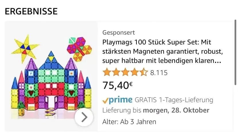 也就是说,虽然都叫Playmags彩窗磁力片,不同店里买到的,可能是完全不同的品质。开团之前,我特意空运了一套过来对比,确认了和我在德亚上买到的品质一样,才放心推荐给你们。德国亚马逊上的Playmags彩窗100件要75欧,我买的早,印象中也要60多欧(约合人民币400多)。![]()
